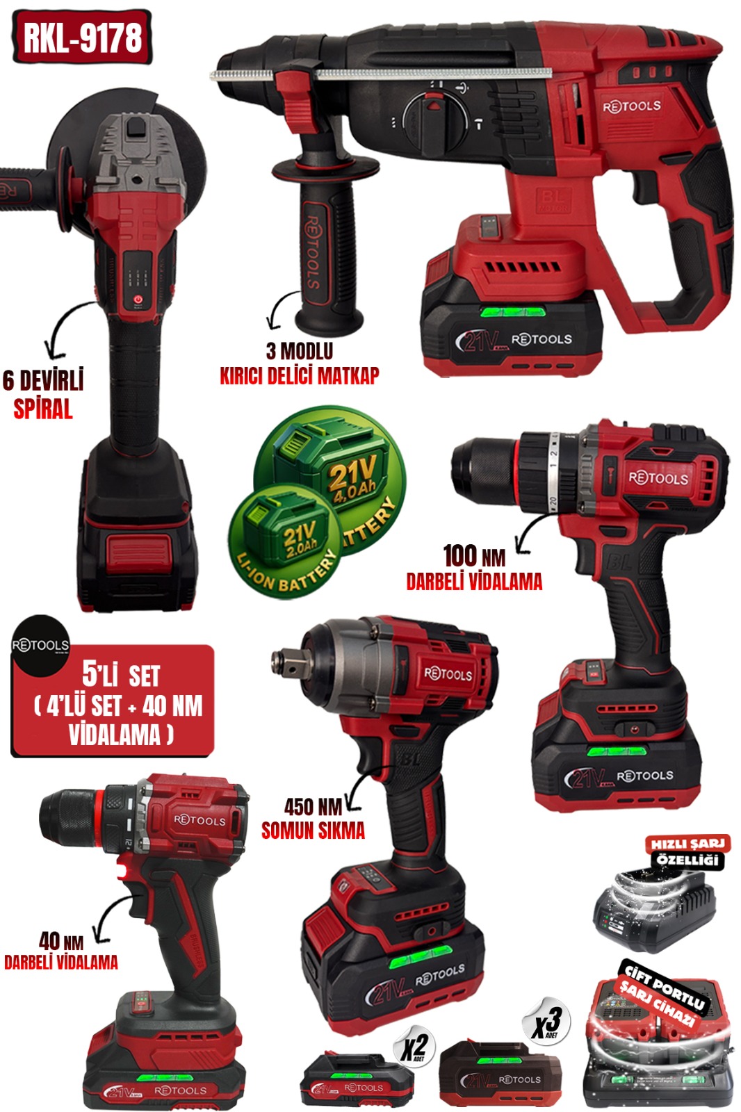RETOOLS RKL-9178 5’li Profesyonel Akülü El Aletleri Seti – 21V Li-Ion Bataryalı