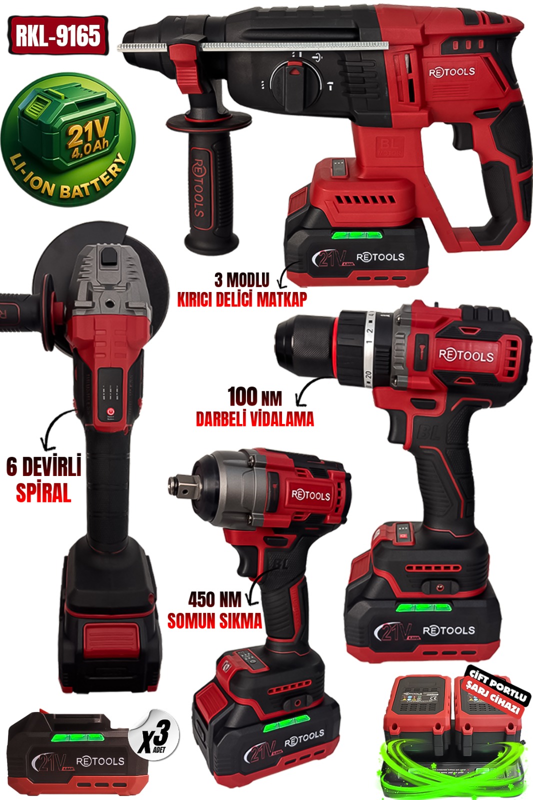 İnşaat, tamirat, montaj ve atölye işlerinizde ihtiyaç duyduğunuz tüm gücü tek bir çantada topladık. Yeni nesil Kömürsüz (Brushless) Motor teknolojisi ile donatılan RETOOLS RKL-9165, maksimum performans, uzun ömür ve yüksek verimlilik sunar. Kesintisiz çalışabilmeniz için 3 adet 21V 4.0Ah Li-Ion Akü ve aynı anda iki aküyü doldurabilen Çift Portlu Şarj Cihazı ile birlikte gelir.