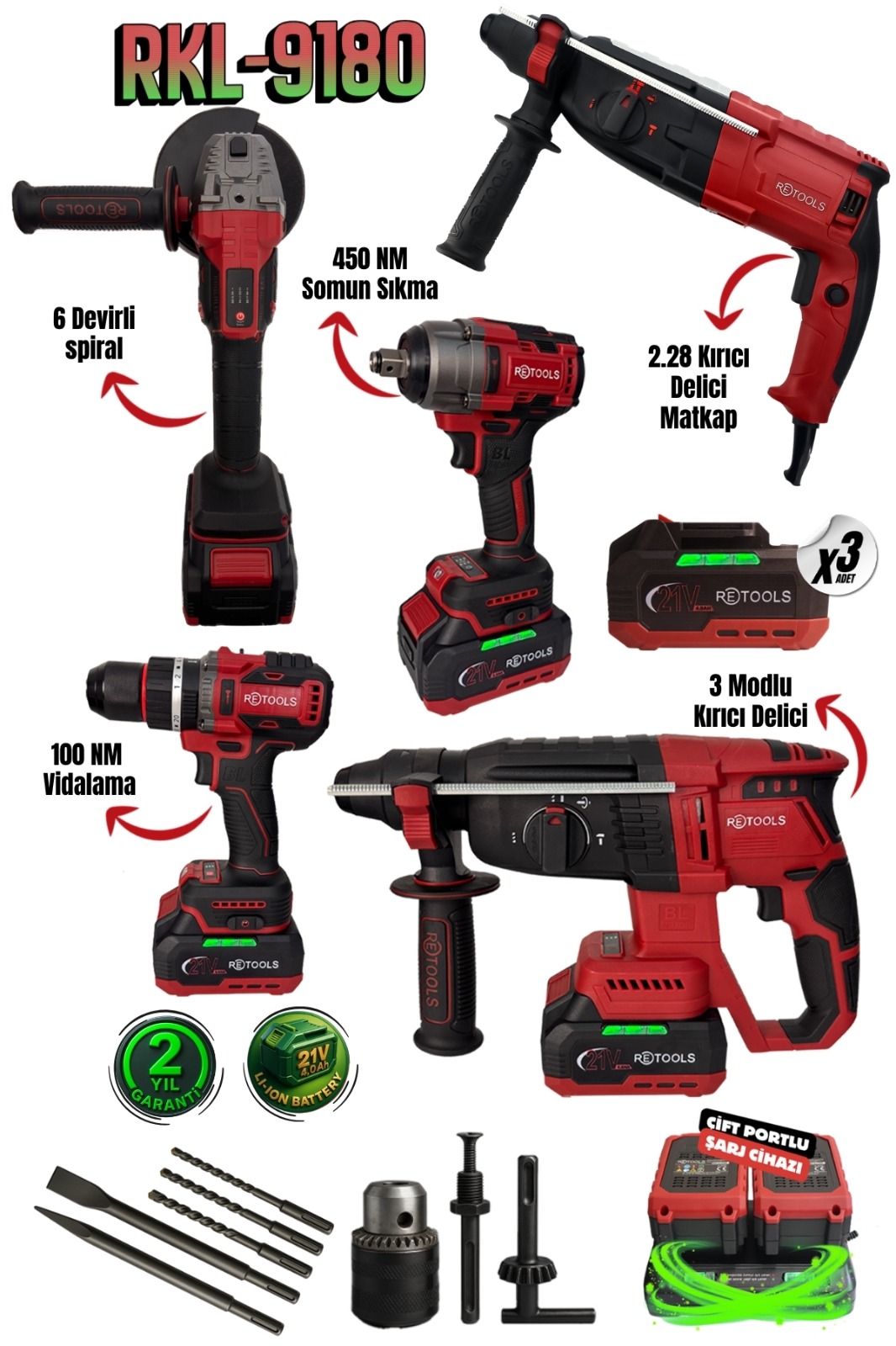 Güç, dayanıklılık ve çok yönlülüğü bir araya getiren RKL-9180 seti; hem profesyonel kullanım hem de ev tipi işler için ideal bir çözümdür. Yüksek performanslı motorları ve ergonomik tasarımı sayesinde zorlu işlerin üstesinden kolayca gelmenizi sağlar.